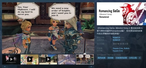 近日,在台北國際電玩展上SE攜手繁中代理專業戶ARC SYSTEM WORKS官宣了已於22年 12月 2日上線Steam平台不支持中文的《浪漫沙加:吟遊詩人之歌高清版》即將在 23年 3月 30日於PS4、PS5、NS主機平台上推出,並同步實裝官方繁體中文版。該經典冷飯,92年在FC推出後,05年曾在PS2平台上推出過重製版。