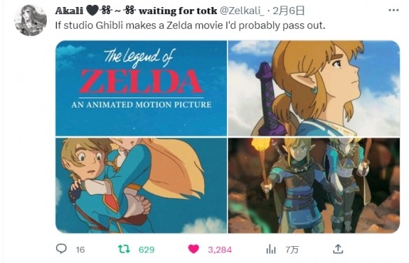 近日,塞爾達系列遊戲狂熱粉絲、推特用戶@Zelkali創作了一組主題為「 如果吉卜力工作室製作塞爾達動畫大電影」的粉絲自製動畫宣傳圖。以吉卜力經典畫風重新繪制的林克和塞爾達不禁令人眼前一亮,浮想聯翩這組合如果真的能成的話~