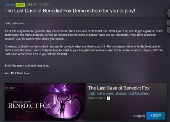 亮相於去年6月Xbox&B社遊戲展示會上,以克蘇魯主題吊詭的美術風格吸引不少玩家眼球的銀河惡魔城like遊戲《本尼迪克特·福克斯的最後一案(The Last Case of Benedict Fox)》在陸陸續續公布各種消息以後。近日,隨著Steam新品節的召開,本作的試玩demo也終於揭開神秘面紗和玩家見面一睹真容,當初就關注本作的玩家絕對不容錯過本次試玩。