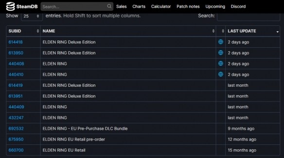 近日,知名Steam輔助網站SteamDB的後台數據顯示,《艾爾登法環》商店頁面悄咪咪迎來了四次數據更新。增加了四條未對外公開鏈接到法環商店頁面的軟體包。根據玩家解包,這些新更新的軟體包是較為常規各種遊戲圖片、價格和文本等顯示在商店頁面的信息。