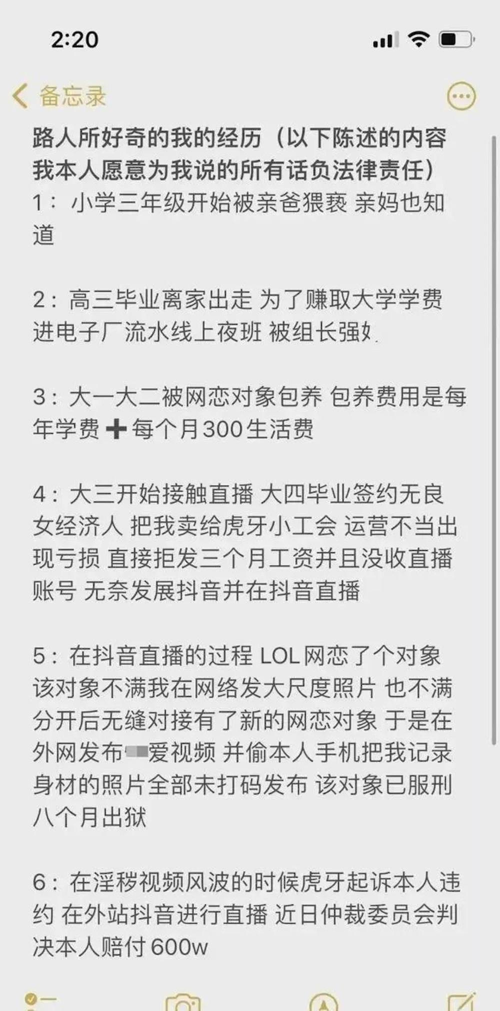 早些時候,她曾經寫過小作文敘述過自己全部的成長經歷,其中包括糟糕的原生家庭(被父親猥褻)、糟糕的職場經歷(在廠里被組長強暴、被直播平台利用合同索取天價違約金)、糟糕的戀愛過程(被前男友發布不雅視頻)——再加上狗頭蘿莉聲稱自己從未賣身、也沒有通過擦邊寫真圖包盈利,從這個視角來看,你很難不對她產生同情。