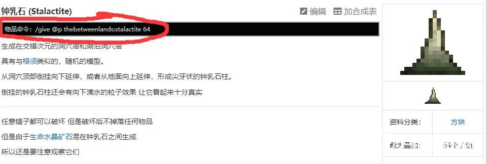 首頁 我的世界 問答 我的世界鍾乳石怎麼獲得? 2023-02-09 可以用指令/give @p thebetweenlands:stalactite 64獲得鍾乳石。1,首先我們進入我的世界官網,點擊右上角SUPPORT查看相關說明。2,然後找到鍾乳石的相關說明,玩家輸入下方的指令就可以獲得鍾乳石了。