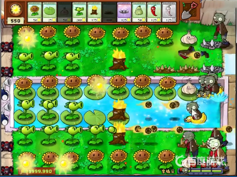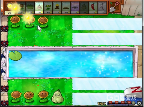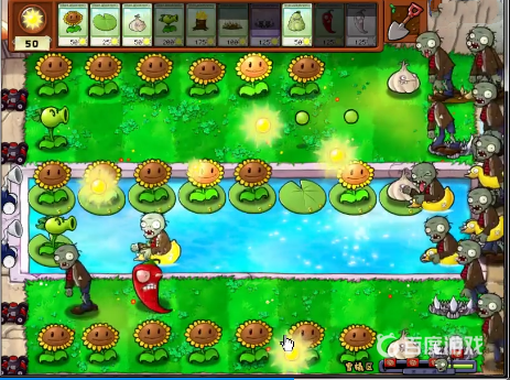 2、種完向日葵的時候就可以先等等,這時候陽光不夠,雪橇一隊一隊地來,需要火爆辣椒清理。火爆辣椒只有兩個,CD又長,所以冰車不要用辣椒,用倭瓜處理。