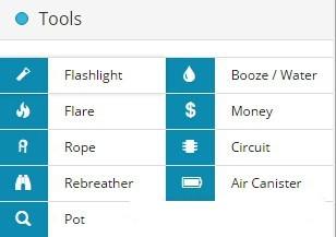 4、工具標記:flashlight——手電筒、Booze/Water——酒水、Flare——照明彈、Money——錢、Rope——繩、Circuit——電路、Rebreather——呼吸器、Air Canister——空氣罐、Pot——罐