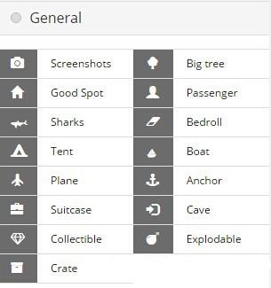 2、一般標記:Screenshots——截圖、Big tree——大樹、Good Spot——好的地點、Sharks——鯊魚、Bedroll——鋪蓋袋、Tent——帳篷、Boat——船、Plane——飛機、Anchor——拋錨、Suitcase——手提箱、Cave——洞穴、Collectible——可收集的、Explodable——爆炸物、Crate——箱子