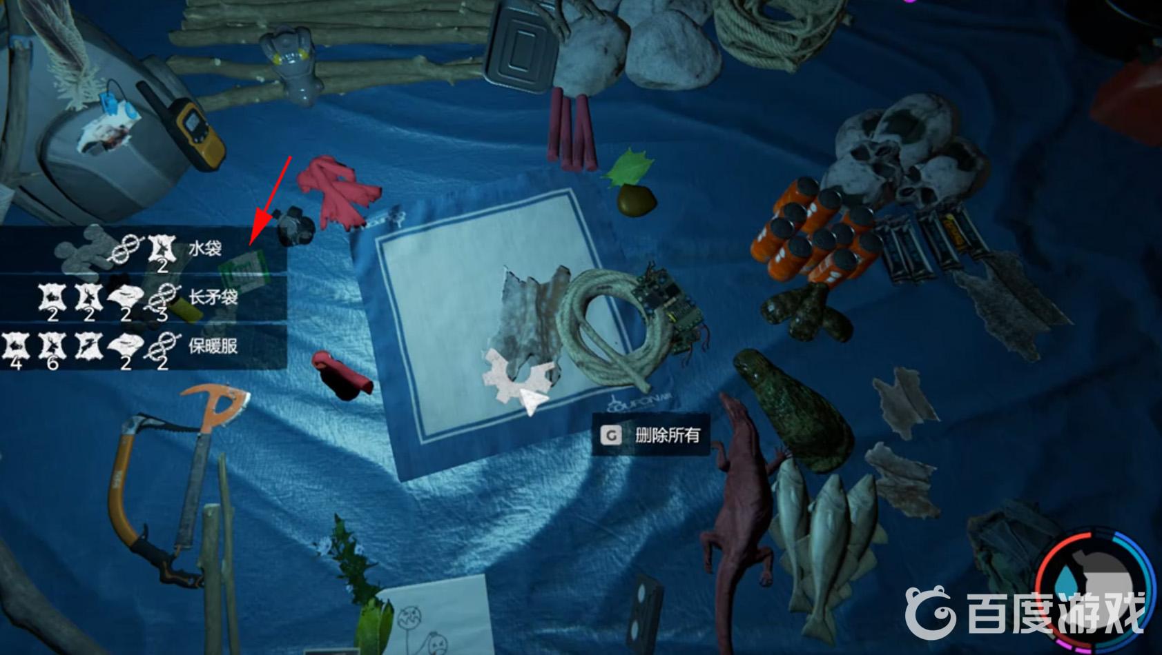1:打開背包系統,水袋是由鹿皮兩塊和一個繩索合成的