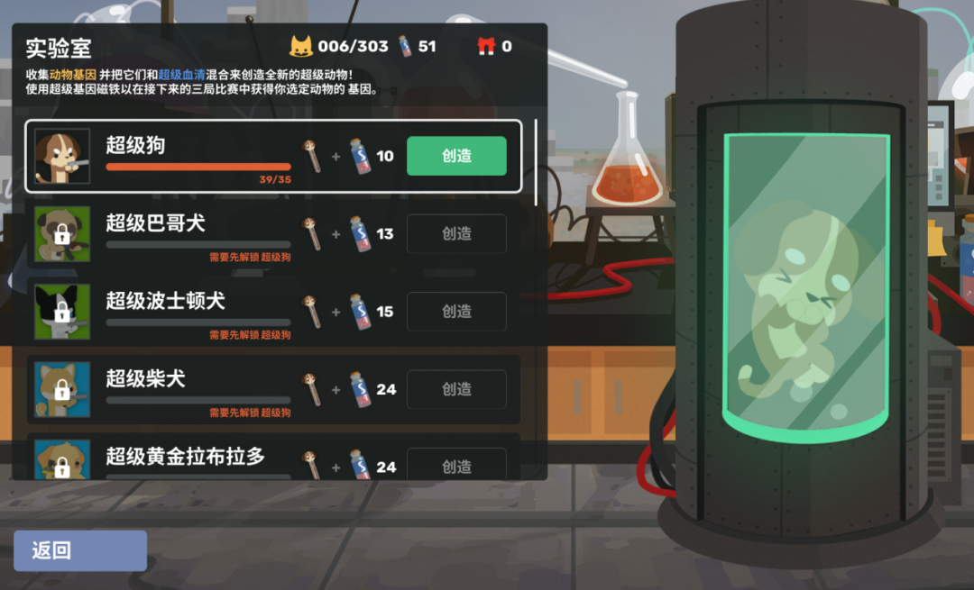 當然,還有另一個特別重要的、讓玩家持續留存的原因——大量的可收集要素,也就是「小動物暖暖」。隨著戰局的積累和等級的成長,玩家可以收集不同動物的「基因」來創造出新的動物: