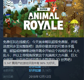 其實它並非是一個「新遊戲」。這個原名Super Animal Royale(直譯過來就是「超級動物大逃殺」)的遊戲,2018年底在Steam上開啟了搶先體驗(Early Access),評價長期保持在「好評如潮」。