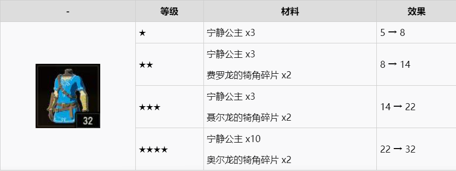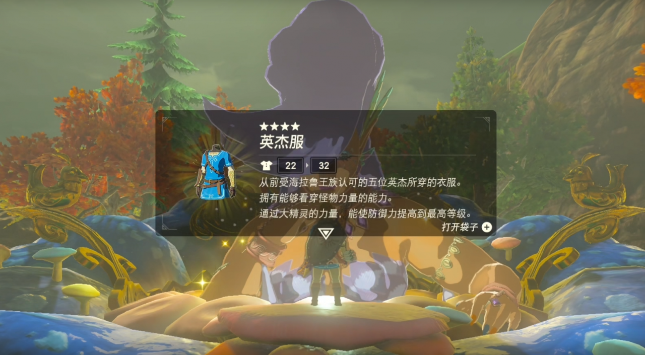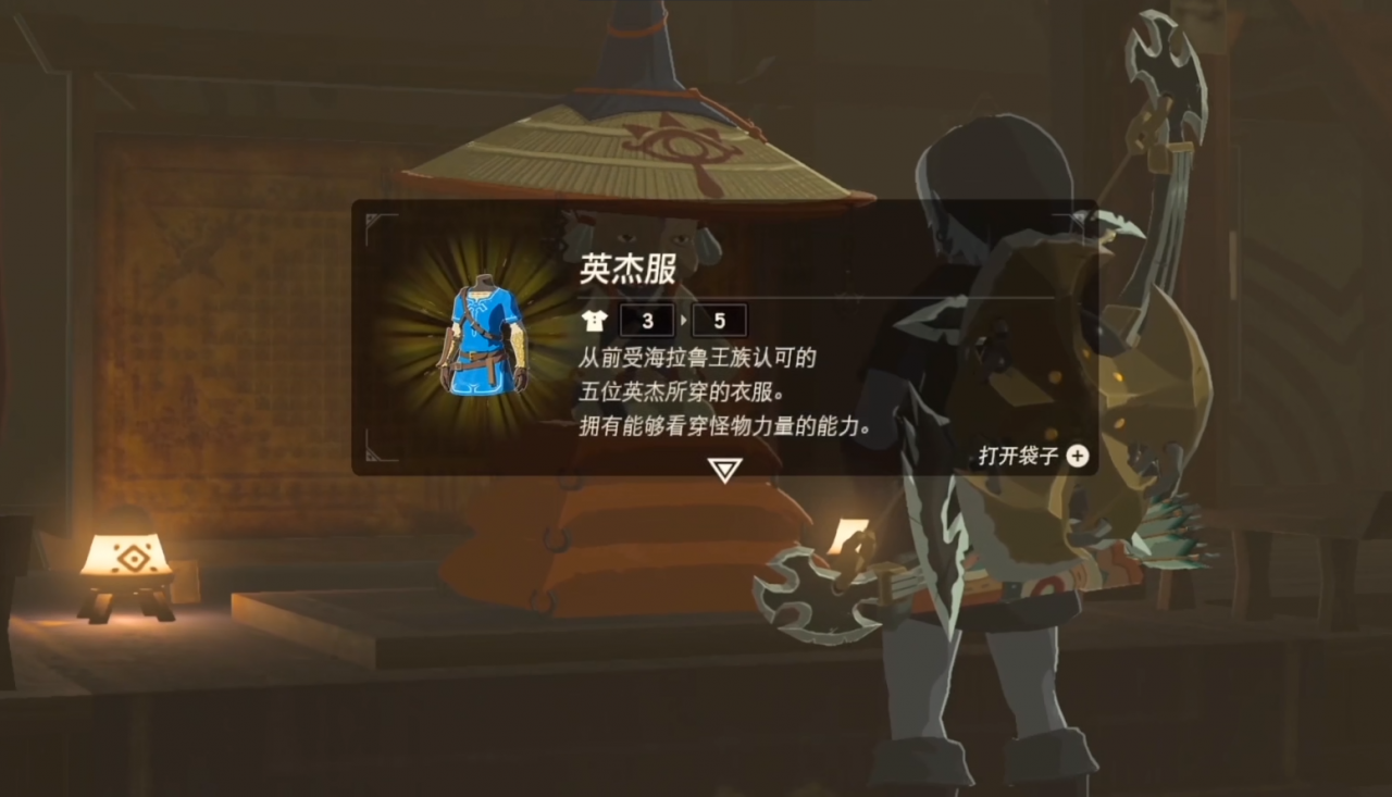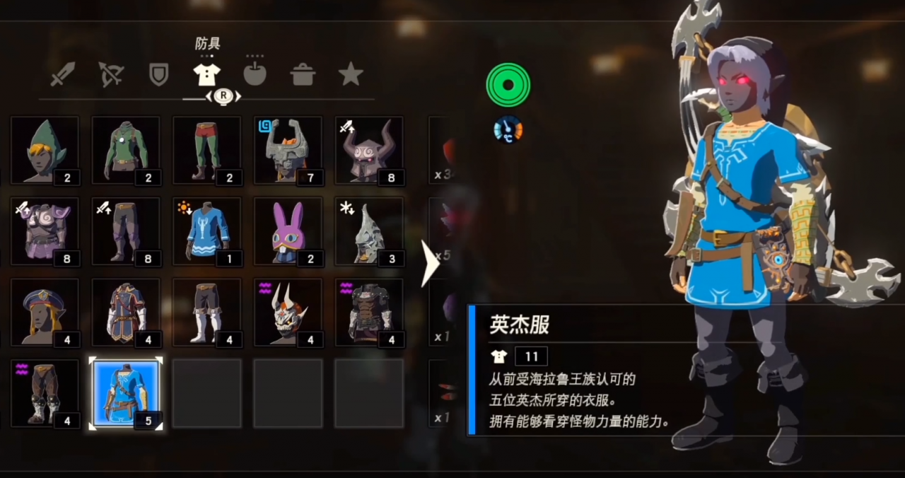 英傑服的防禦力在整個遊戲中是單件最高防禦力的裝備,而且顯示血量可以更容易地發現敵人,對新手非常的友好。只要完成主線,就可以在前期獲得,不過僅此一件,沒有套裝,因此後期實用價值有所下降。搭配海利亞褲子之後,就可以實現CG中的外觀,另外這也是公主送給林克的禮物,非常具有收藏價值。