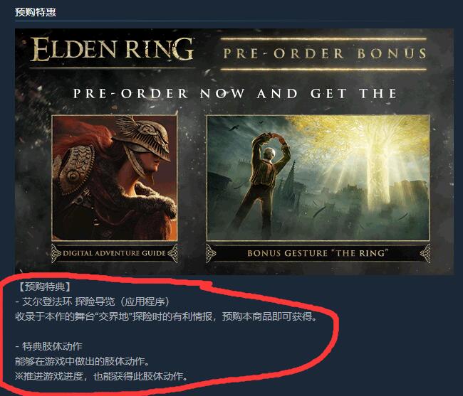 首頁 艾爾登法環 問答 艾爾登法環預購有什麼獎勵? 2022-07-01 艾爾登法環預購可以獲得探險導覽和特典肢體動作。1,首先我們進入Steam里搜索艾爾登法環,點擊進入遊戲界面。2,然後在界面中往下滑動,就可以發現艾爾登法環預購的獎勵了,預購獎勵為艾爾登法環探險導覽(應用程序)和特典肢體動作。