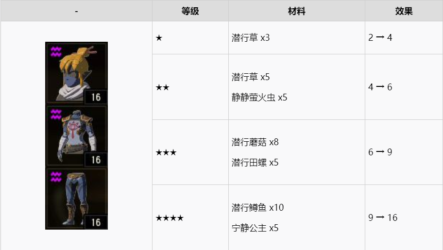 潛行套的防禦力低了一些,是對新手練習偷襲還有抓小動物時比較有用的一套裝備,在這些基本技巧熟練了以後基本上就沒有了太大的作用,2星後夜間加速移動聊勝於無,除了強迫症玩家以外,無滿星的必要。