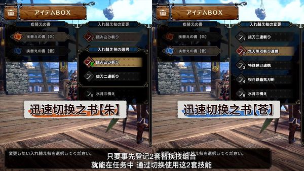 新要素「迅速切換」,玩家只需要在狩獵開始前通過「迅速切換之書」登記2套替換技組合,即可在狩獵中瞬間切換替換技,更可衍生迴避怪物攻擊或調整站位的「沖鋒」。