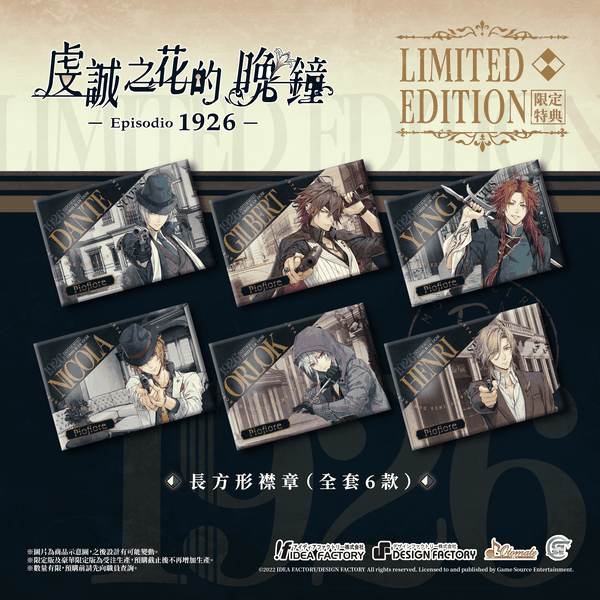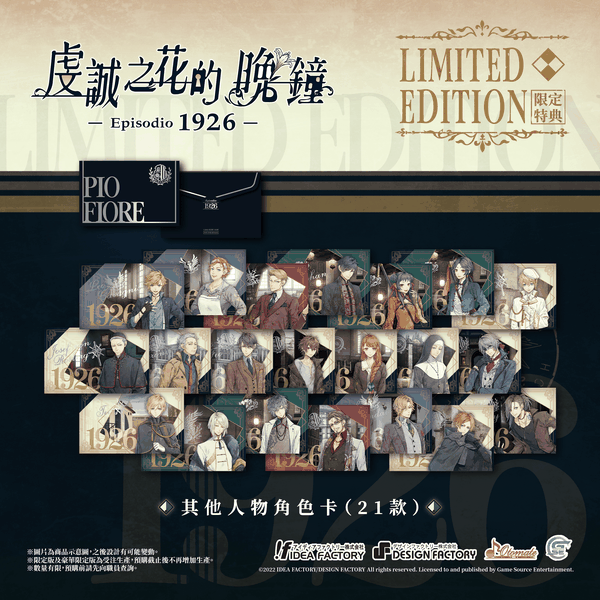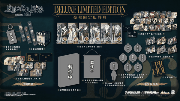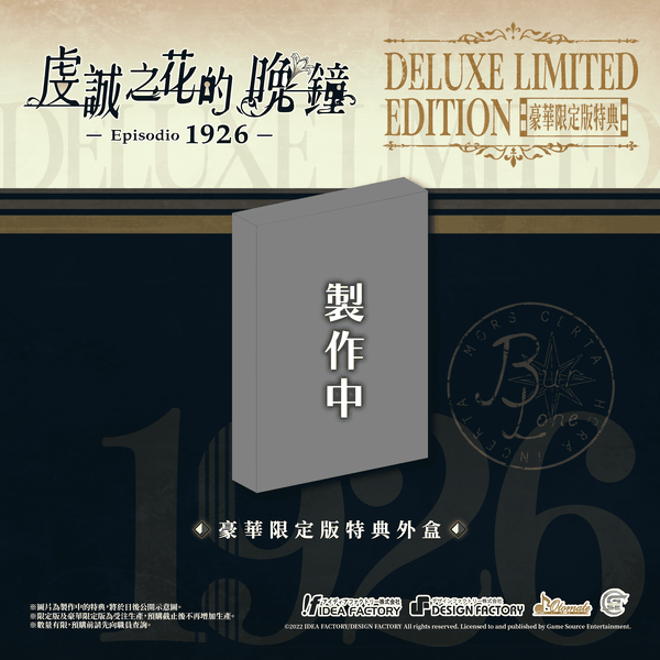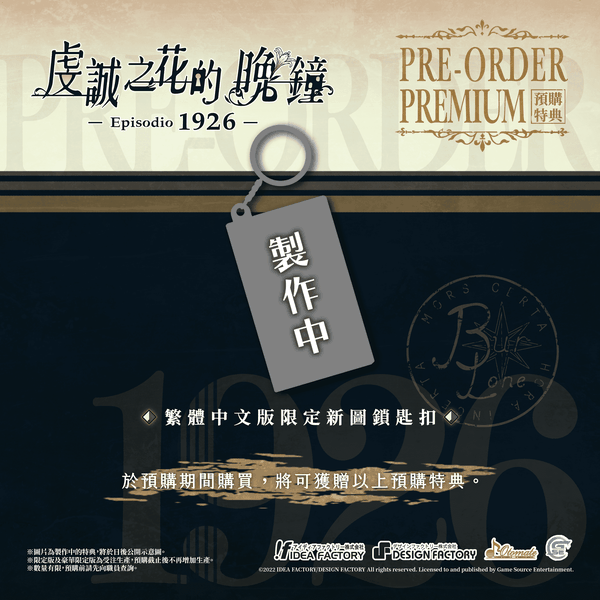 除已公開的限定版特典外盒之外,《虔誠之花的晚鍾-1926-》的原畫–「RiRi」老師更為豪華版特典外盒繪製了全新的繁體中文版限定封面圖!另有預購特典鎖匙扣、限定版主要人物鎖匙扣(全7款),以及豪華版A3尺寸掛畫,也使用了全新限定封面圖的設計。有關限定封面的進一步消息將於日後公布,敬請期待!