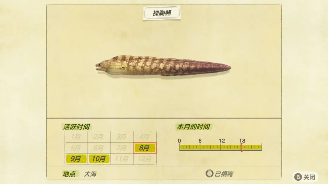 58、裸胸鱔 | 賣價:2000 | 棲息地:大海 | 魚影:細長型 | 時間:全天