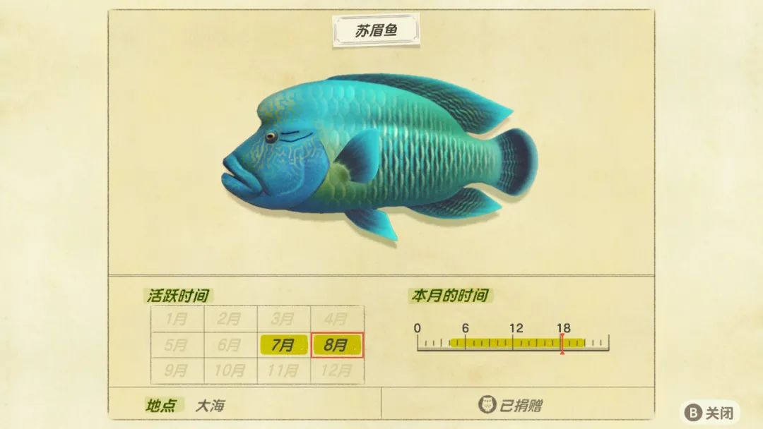 本月唯一需要注意的就是蘇眉魚,蘇眉魚的稀有度較高,而且次月就會消失,所以未收集的玩家可以在本月著重釣一下海魚。