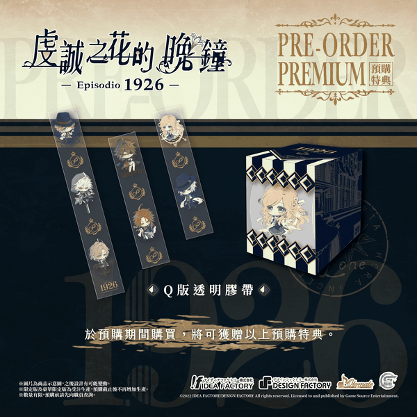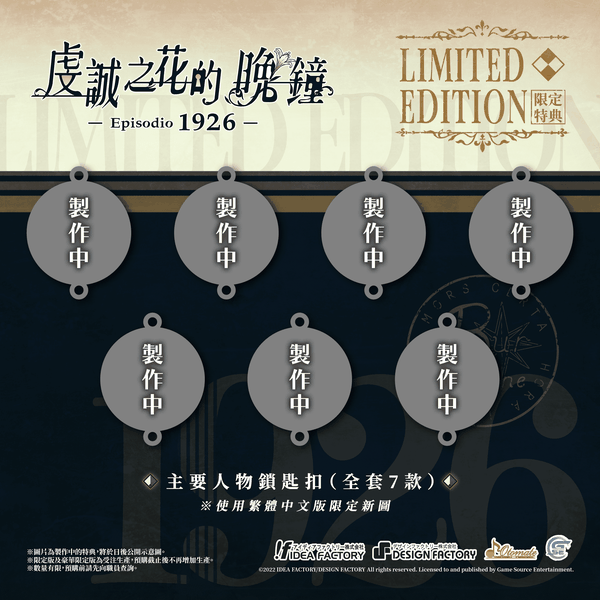 除已公開的限定版特典外盒之外,《虔誠之花的晚鍾-1926-》的原畫–「RiRi」老師更為豪華版特典外盒繪製了全新的繁體中文版限定封面圖!另有預購特典鎖匙扣、限定版主要人物鎖匙扣(全7款),以及豪華版A3尺寸掛畫,也使用了全新限定封面圖的設計。有關限定封面的進一步消息將於日後公布,敬請期待!