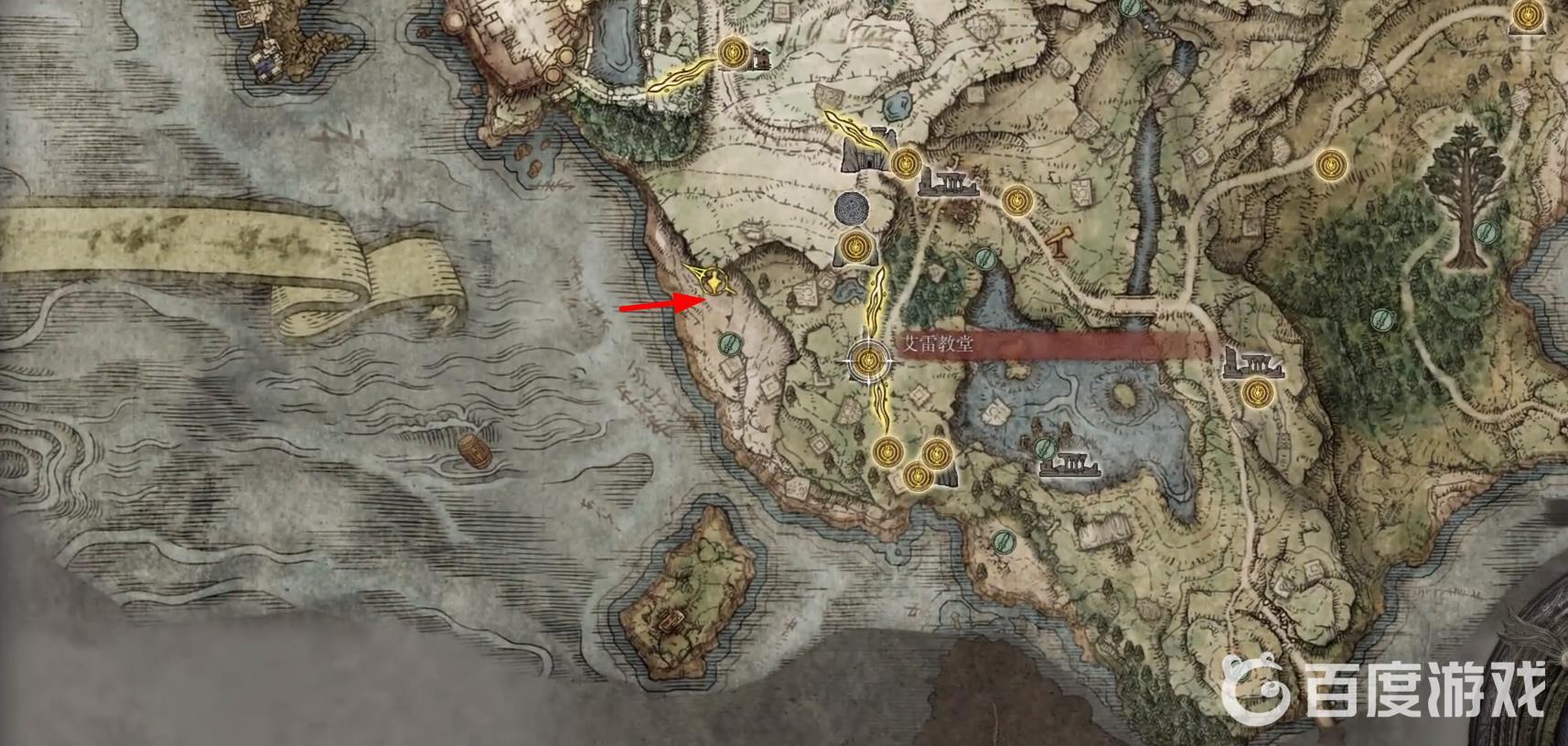 1、艾爾登法環中獲得戰灰迴旋斬的方法有兩個,一個是在艾蕾教堂附近的西部海灘處,具體位置如下圖所示,