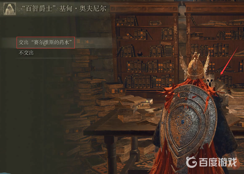 玩家獲得塞爾維斯的葯水後回到大賜福和百智爵士交談,選擇「交出塞爾維斯的葯水」選項,如下圖,