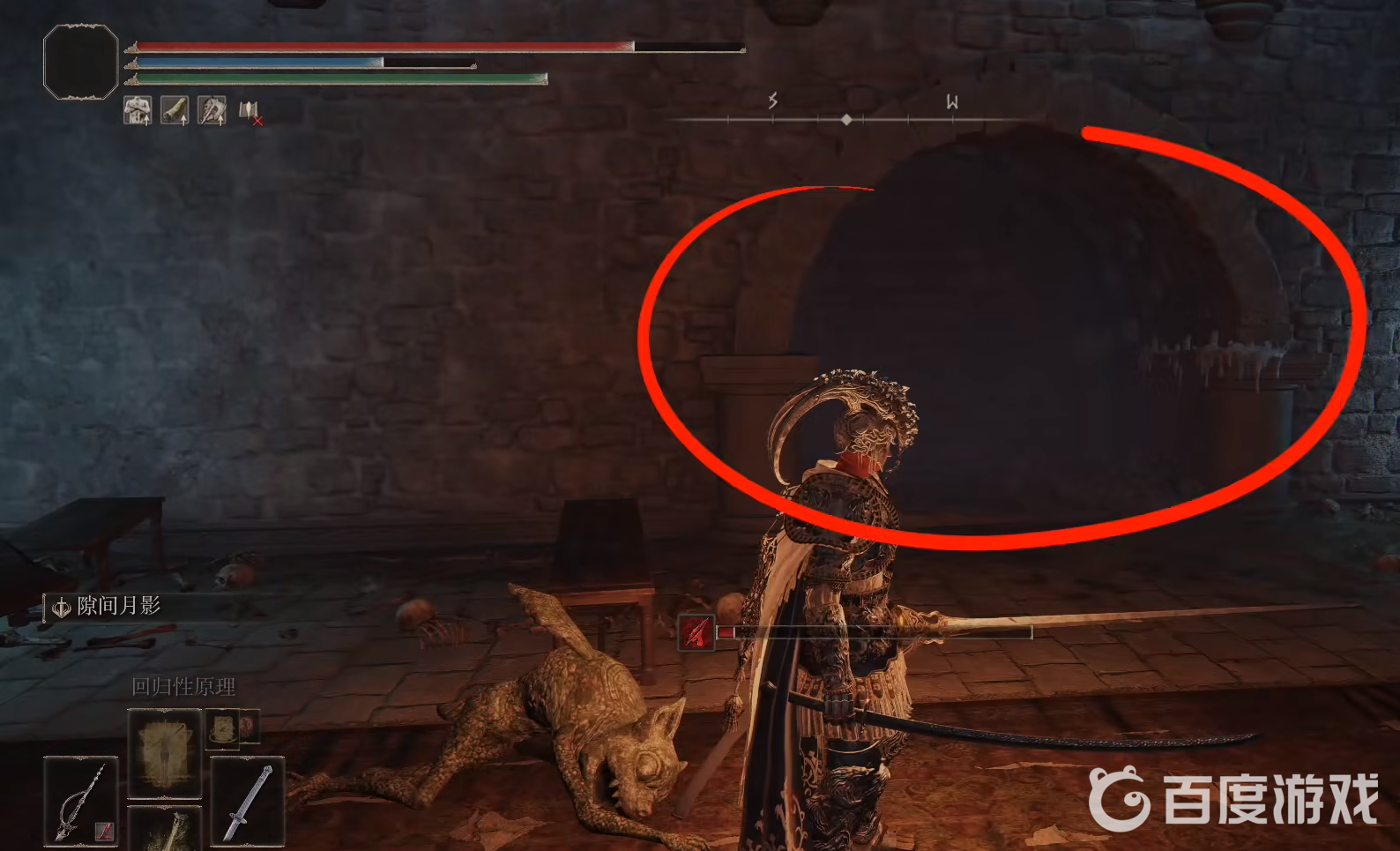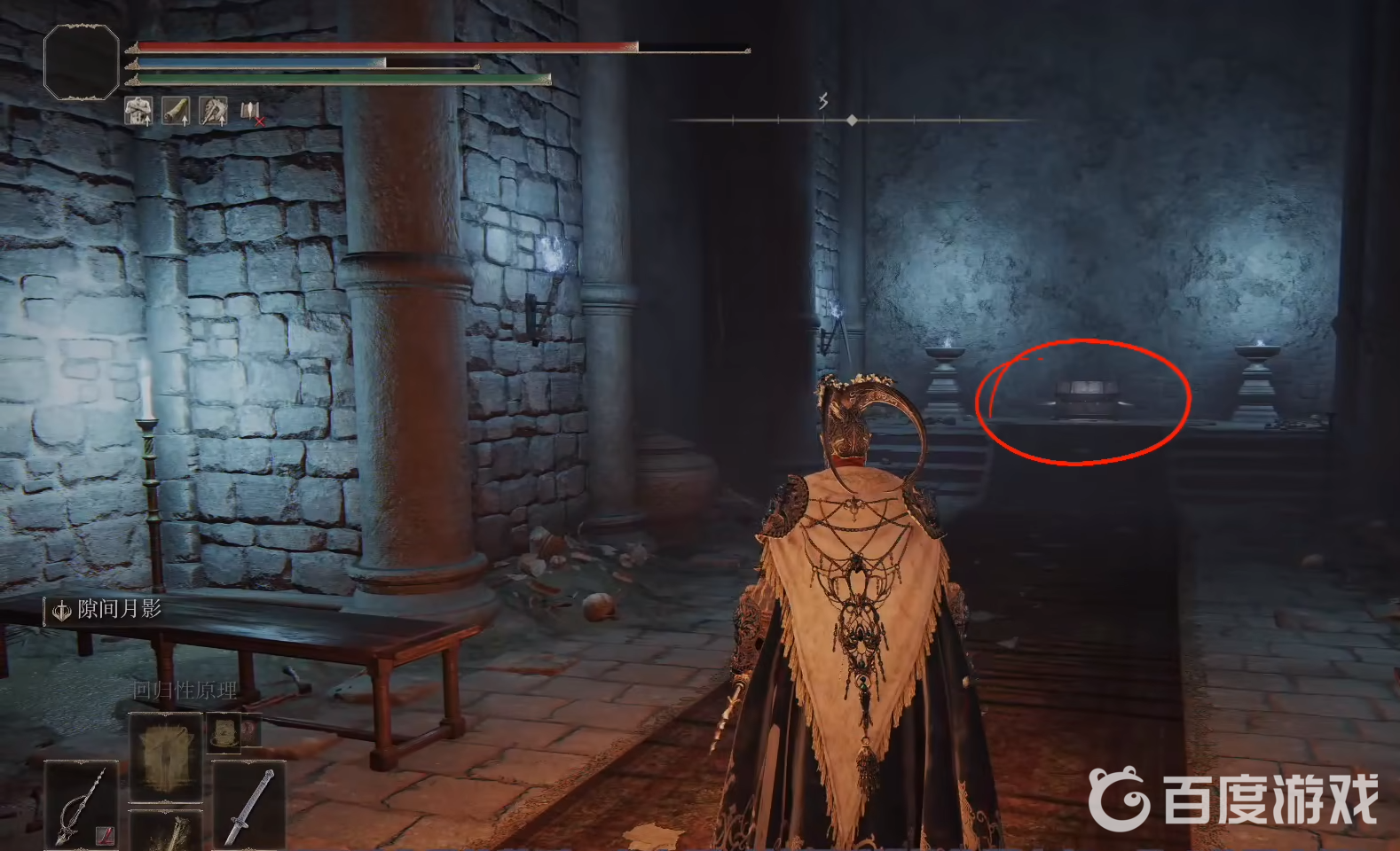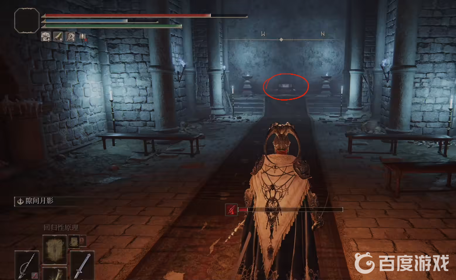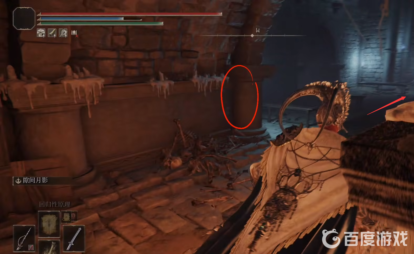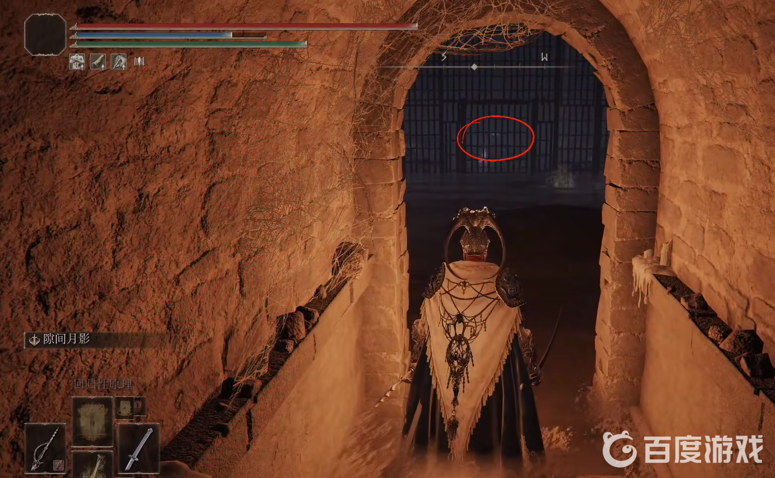 8、擊殺成功後,向門洞裡面走,這裡是上層「鐵柵欄」的位置,柵欄裡面有一個「傳送寶箱」,記住這個位置,