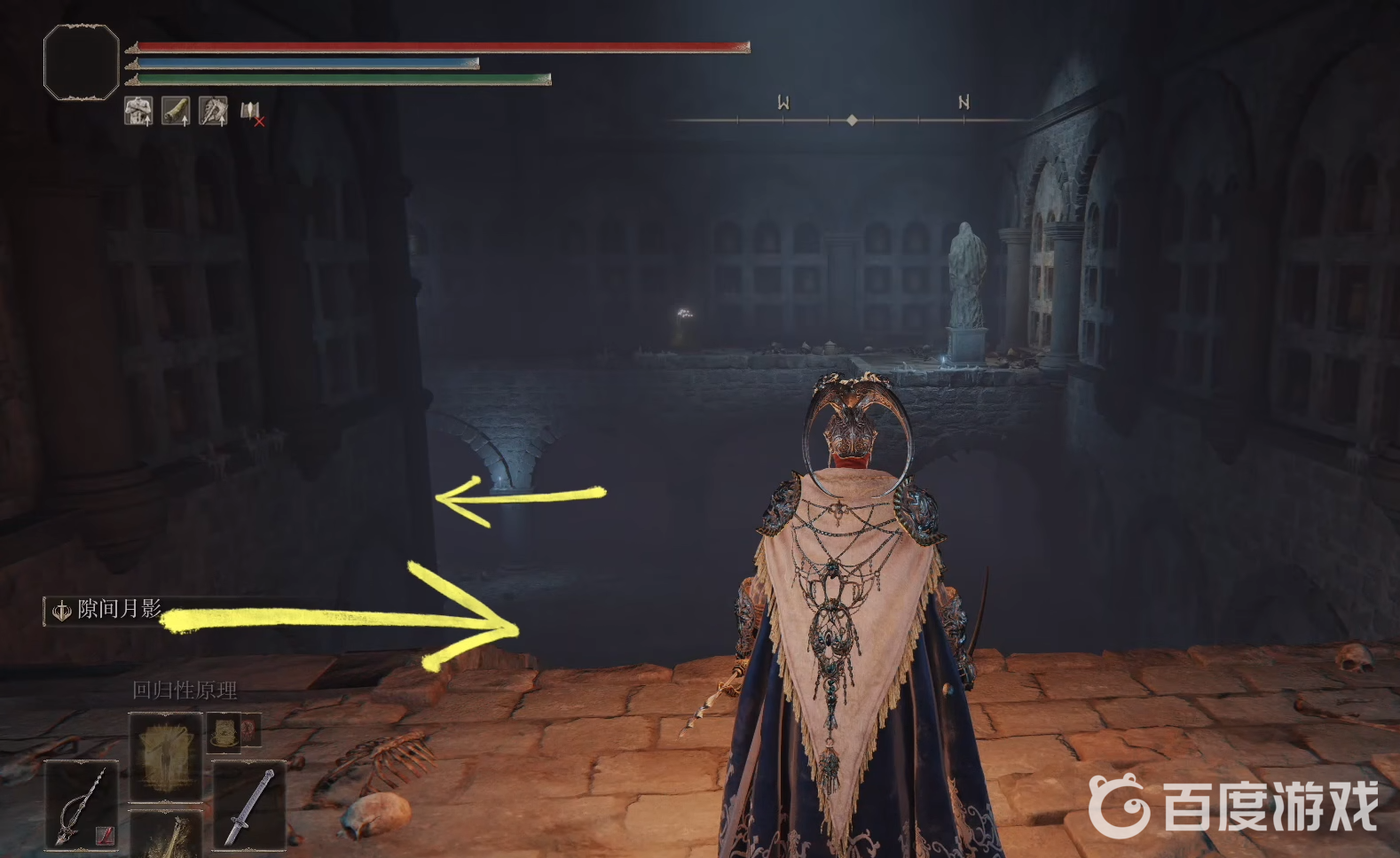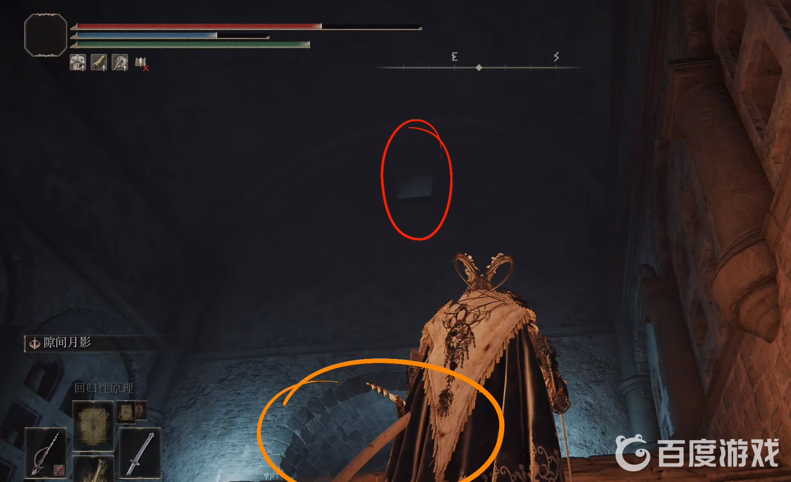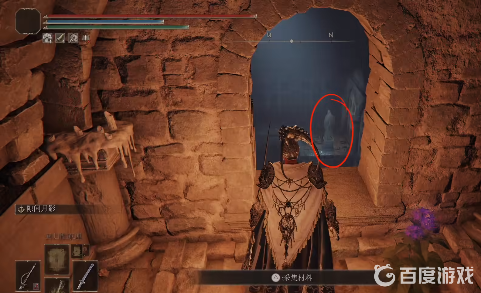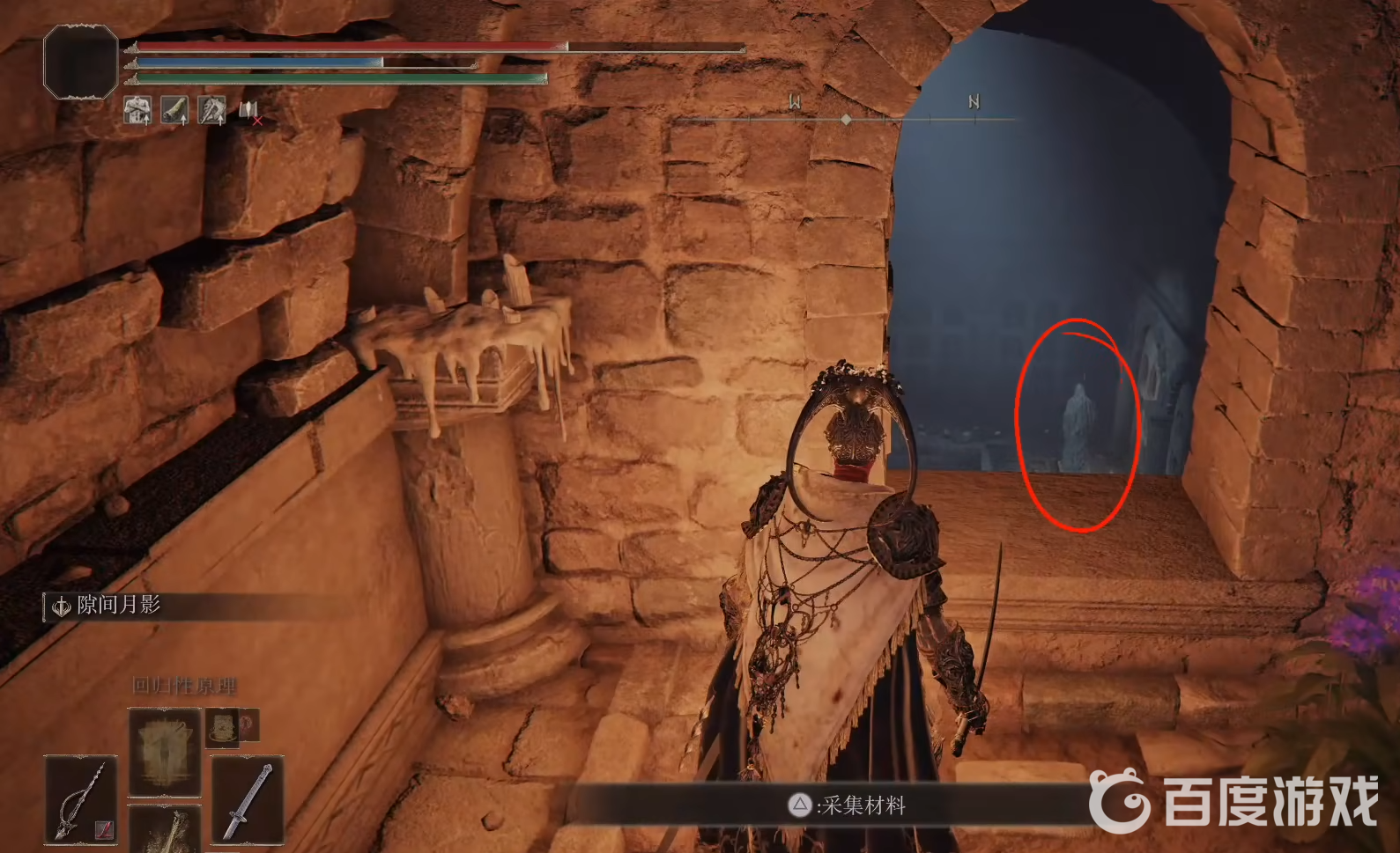 4、來到窗戶位置向下面看,下面這個雕像,就是機關的位置,從窗戶位置往下面跳,到達下面後,注意前面的雕像,