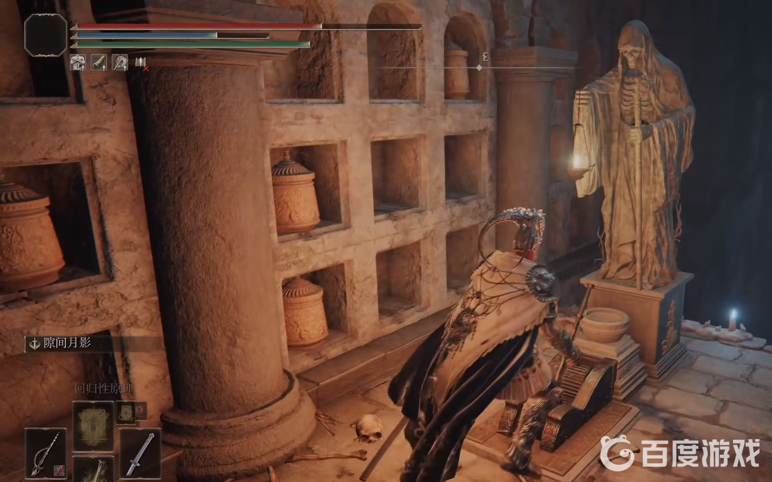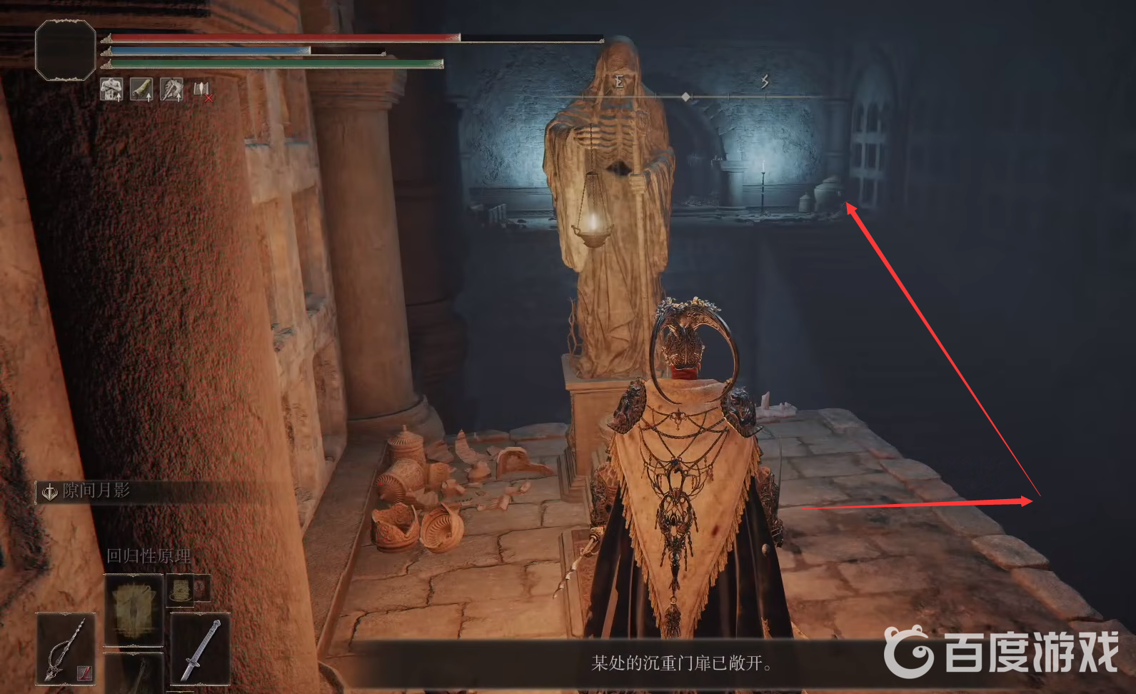 5、這裡要先介紹一下亞雷薩副墓地的傳送機制,這個墓地有上下兩層,有雕像的這個是上層,還有一層和這層基本一模一樣建模的區域是下層,下層沒有這個雕像,也就沒有機關,我們可以通過打開「傳送寶箱」,傳送到上層或者下層的各自區域,上層和下層之間也是可以通過特定的「傳送寶箱」相互傳送。