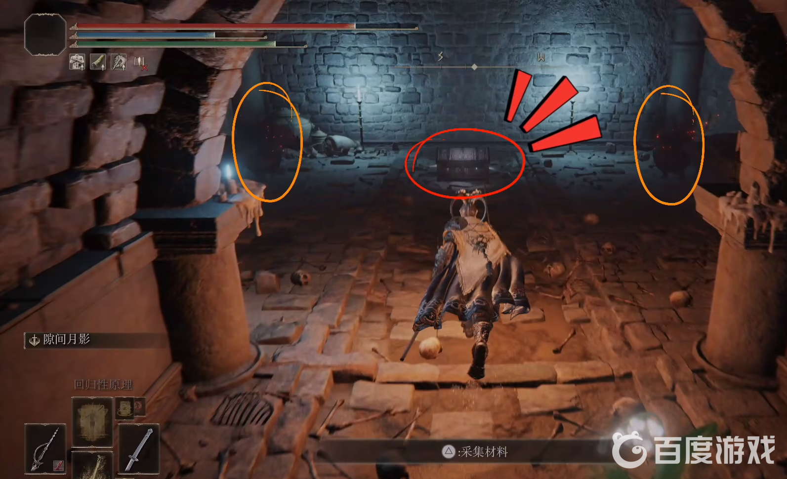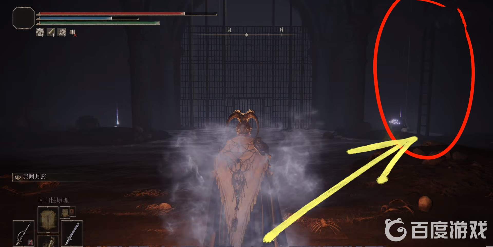 15、打開「傳送寶箱」被傳送到下層的「鐵柵欄」裡面了,右側有梯子,左右兩邊有兩個小壺,要朝著梯子的位置跑,這個梯子是整個墓地唯一一個能通往雕像的地方,記住這裡,