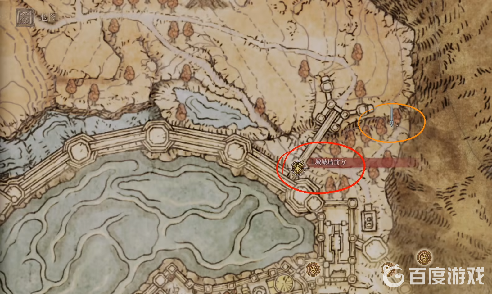 1、亞雷薩副墓地賜福點位置如下圖所示,我們可以從王城城牆前方篝火點出去,來到下圖標記的位置,