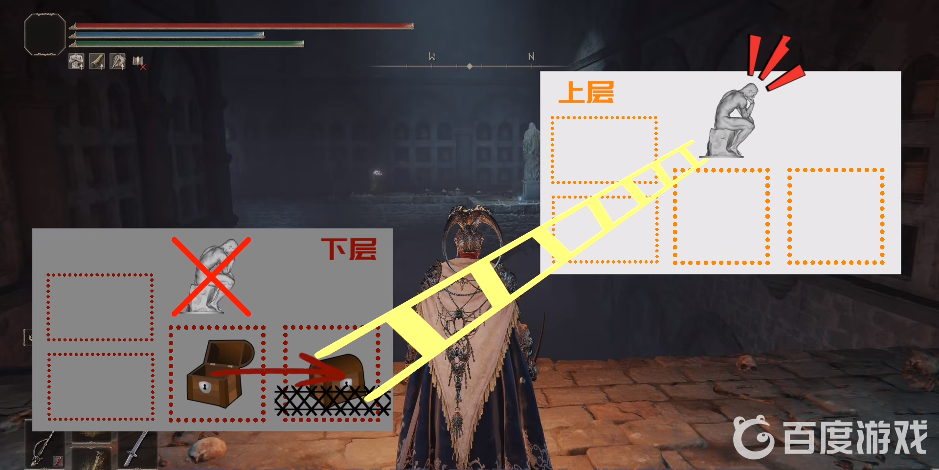 6、想要到達上層的這個雕像位置開啟機關,唯一的路徑就是通過「傳送寶箱」傳送到下層的「鐵柵欄」內,再通過裡面的梯子才能到達,