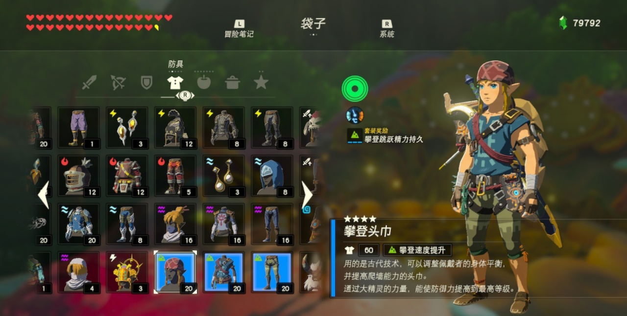 本作實用度第二高的服裝,因為本作有不少時間都花在了登山上,而攀登套裝的效果就是加快攀登速度。全套強化完第2 階段後同時裝備的話,還會附加攀登時跳躍精力消耗減半的超實用效果,因此強烈推薦入手後立刻強化!不過由於攀登時沒法戰鬥,所以強化完第2 階段後就可以停手了。雖然怎麼看都不像是戰鬥用的,但每件強化滿後還是有20 點防禦力。