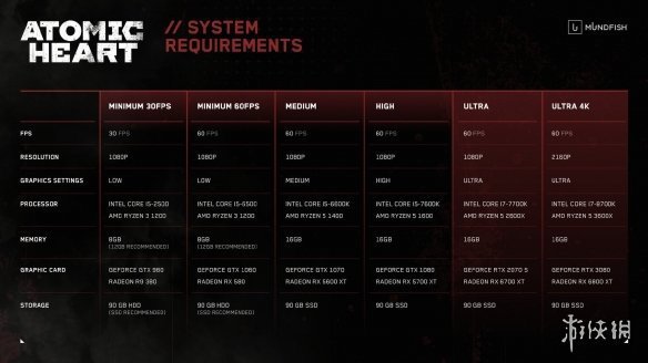 《原子之心》公布了PC的詳細配置,在30幀/1080P下玩家只需要GTX 960顯卡即可,而想在1080P下流暢運行則需要2070S+16G內存,硬碟空間則為90G。