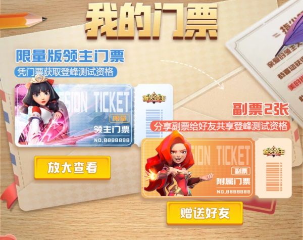 進入頁面登錄賬號——點擊【領取】搶限量「領主門票」,並同時獲贈2張「附屬門票」——分享副票給2位好友——好友進入後登錄賬號即可兌換測試資格。