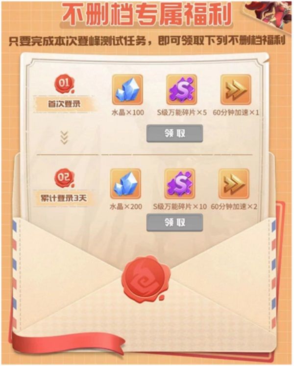 不僅如此,玩家在本次測試中,完成首次登錄遊戲即可搶先鎖定不刪檔專享福利!其中,累積登錄滿3日後即能收獲額外「水晶」與「S級萬能碎片」等獎勵。
