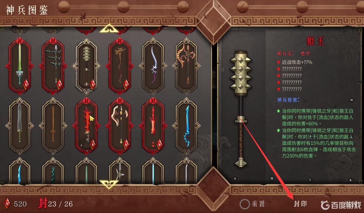 1、封印就相當於禁用武器,封印後的武器將不會在接下來的闖關中出現,可以提高其他武器被刷出的概率。進入初始點的時候,點擊劍冢查看神兵圖鑑。