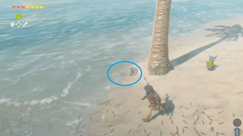 1、先跟石碑旁的NPC對話,他會讓你去找石碑碎片,一個在神廟位置東邊不遠的椰子樹下邊。
