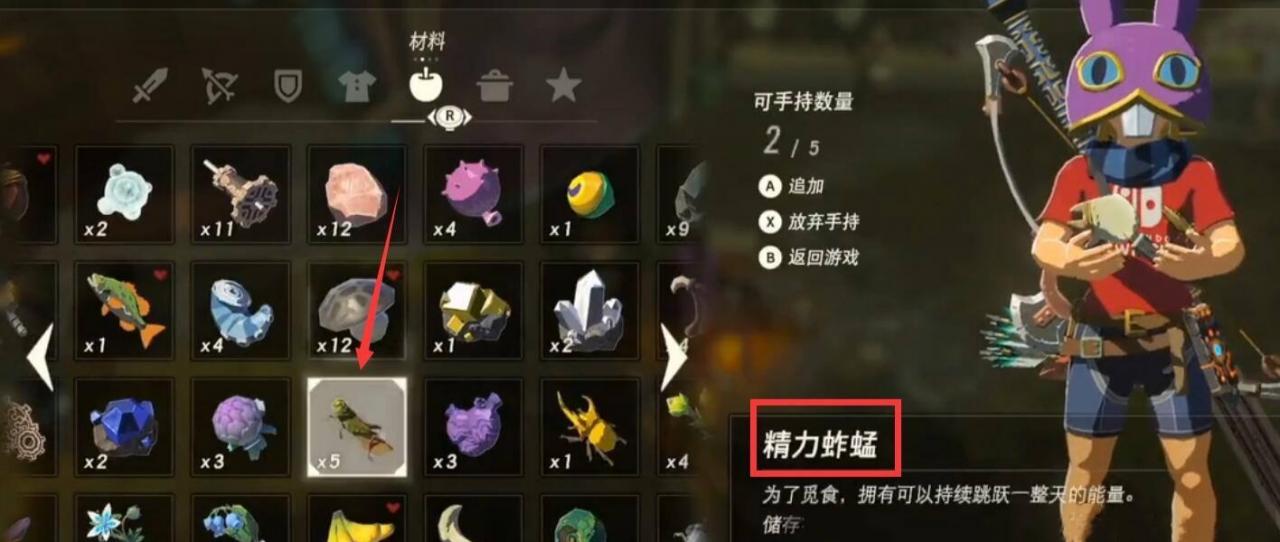 5、將波克布林的牙齒拿在手上後,我們再選中精力蚱蜢並按下選擇鍵,然後精力蚱蜢會直接拿在手上,然後我們退出材料界面