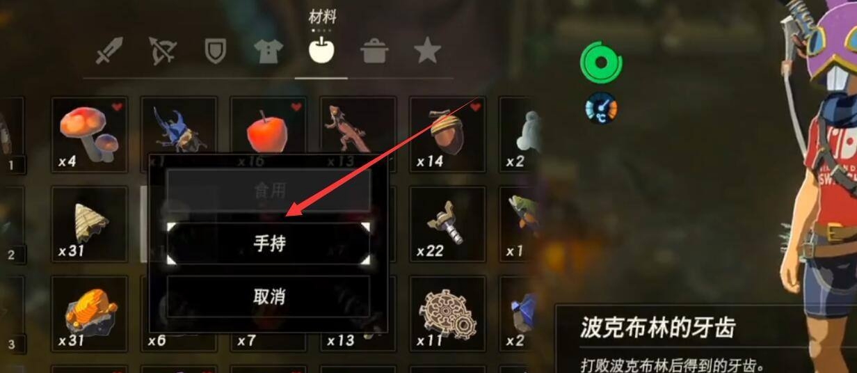 4、接著我們選擇手持選項,將波克布林的牙齒拿在手上