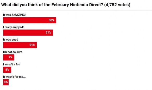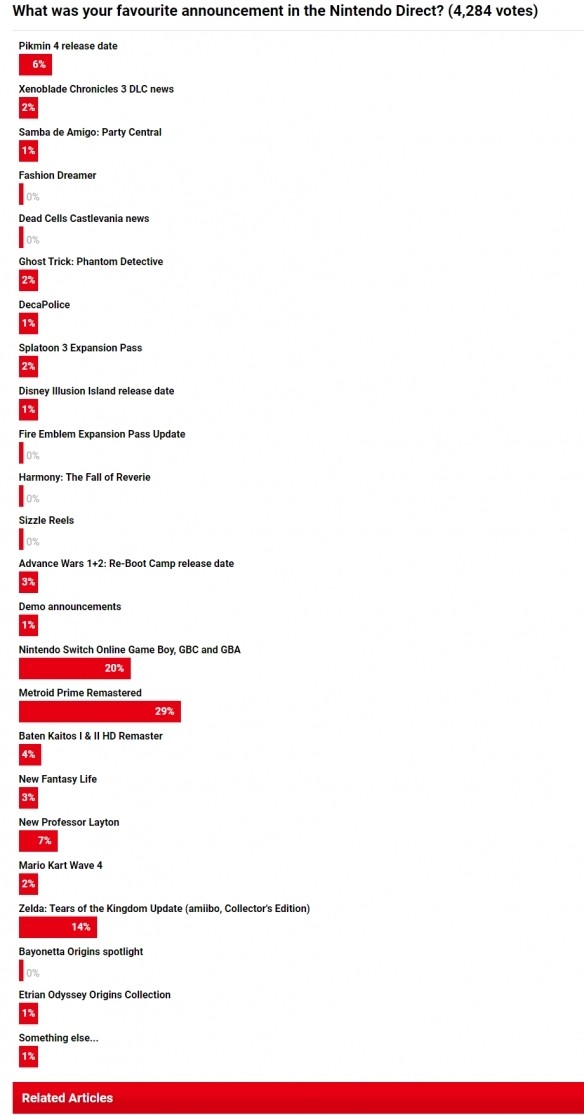 任系遊戲媒體「Nintendo Life」慣例在直面會結束後發起了玩家滿意度投票。在將近五千名玩家的投票中,《銀河戰士Prime復刻版》以29%的得票,成為本次直面會玩家最喜歡的遊戲;令人頗感意外的是NS會員服務新增的GB/GBA懷舊遊戲以20%的得票率位列第二;年度遊戲級大作《塞爾達傳說:王國之淚》以13%得票屈第三名。