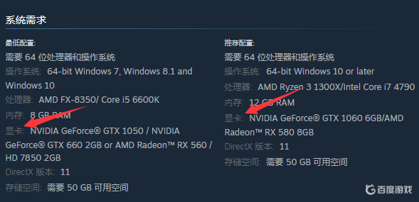 2、然後在界面底部即可看到官方給出的配置要求,該游戲最低需要NVIDIA GeForce GTX 1050 / NVIDIA GeForce GTX 660 2GB 或 AMD Radeon RX 560 / HD 7850 2GB的顯卡,推薦顯卡為NVIDIA GeForce GTX 1060 6GB/AMD Radeon RX 580 8GB,而750顯卡完全滿足顯卡要求,所以用750顯卡是可以玩的。