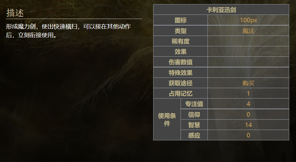 首頁 艾爾登法環 問答 艾爾登法環卡利亞迅劍怎麼用? 2022-07-01 卡利亞迅劍是卡利業王室的其中一種魔法, 能形成魔力劍,使出快速橫掃,在卡利亞的劍類魔法之中,是戰鬥中相當實用著名魔法,技能描述是形成魔力劍,使出快速橫掃,可以接在其他動作後,立刻銜接使用。屬性如下圖所示。