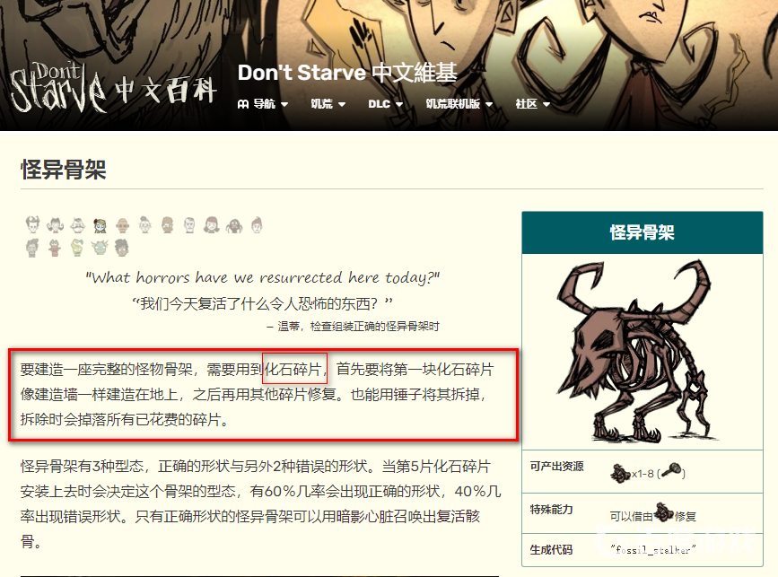 首頁 飢荒聯機版 問答 飢荒聯機版化石碎片有什麼用? 2023-02-10 化石碎片的唯一用途就是拿來組合成怪異骨架。要建造一座完整的怪物骨架,需要用到化石碎片,首先要將第一塊化石碎片像建造牆一樣建造在地上,之後再用其他碎片修復。也能用錘子將其拆掉,拆除時會掉落所有已花費的碎片。