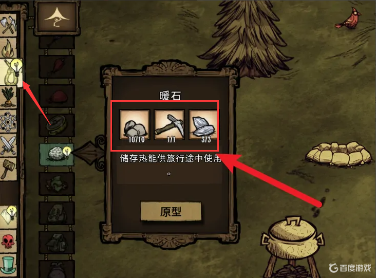 解鎖二本科技,在生存欄中找到暖石,使用10個石頭、3個燧石和1把鋤頭即可合成。