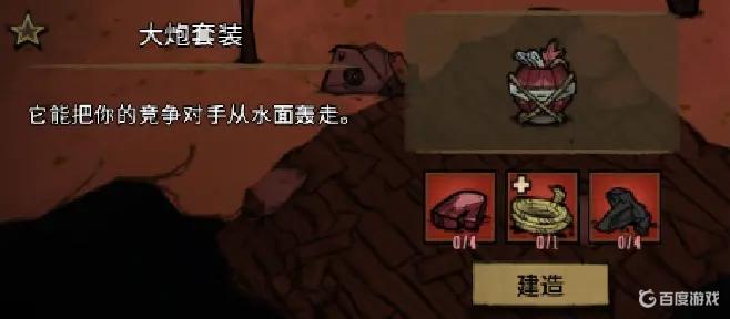①大炮套裝:能攻擊範圍為正前方45°扇形,長度2格內任意目標。建造材料為棕櫚松果樹鱗片*1、繩子*1、木炭*4。