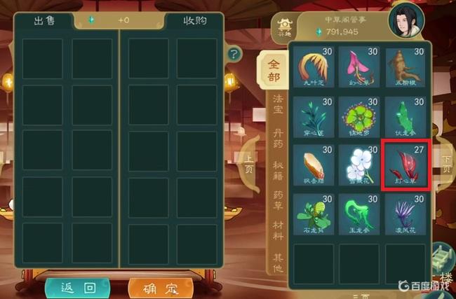 2、與中草閣的管事對話,從他這裡用靈石就可以購買燈心草。