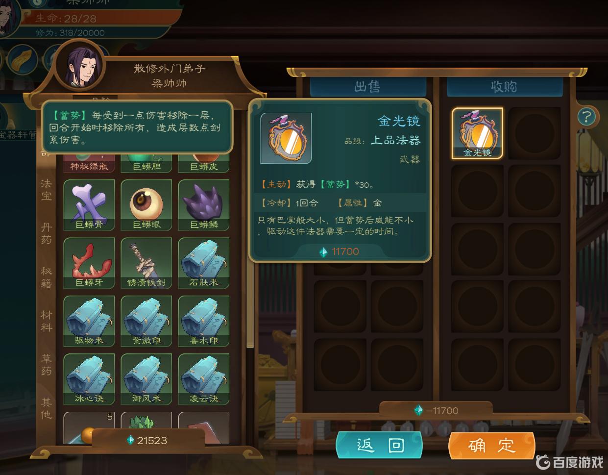 1、金光鏡在逸風城武器店購買,進入覓長生遊戲,前往【逸風城】並點擊進入【寶器軒】。
