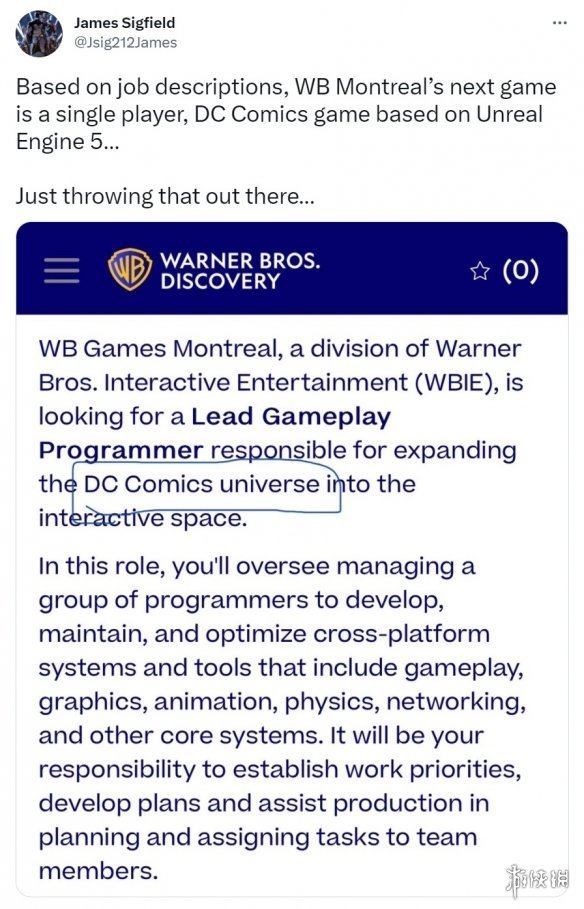 最新消息顯示,《哥譚騎士》開發組華納蒙特利爾的下一款游戲將會是一款單人游戲,並且它仍然是基於DC漫畫宇宙設定的一款游戲。
