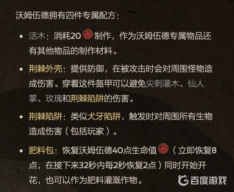 2、沃姆伍德擁有四件專屬配方:活木(基礎製作材料)、荊棘外殼(防禦)、荊棘陷阱(傷害)、肥料包。