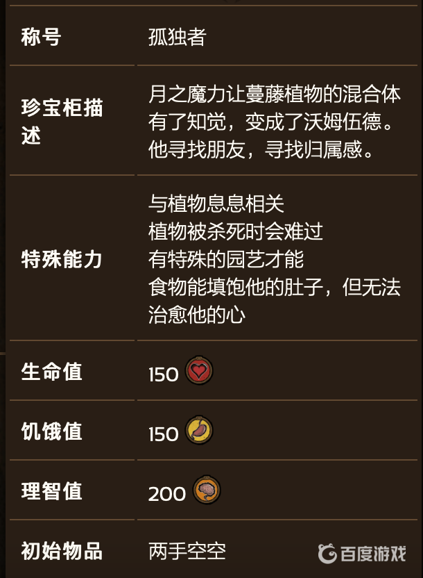 1、饑荒遊戲中,沃姆伍德又被叫做孤獨者,因為簡介中有這么一句話:孤獨者沃姆伍德並不屬於這裡。他出生時的初始值是:生命值150、飢餓值150、san值200,其san值相對來說比較高。但是沃姆伍德初始不帶任何物品。