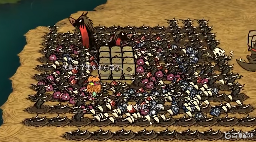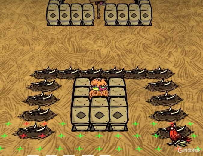 4、然後在附近用犬牙陷阱圍城圈,中間放一塊肉用石牆圍起來。