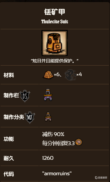 銩礦甲需要消耗6個銩礦 4個噩夢燃料製作,這一配方在單機版中屬於遠古欄,聯機版中屬於遠古偽科學分類。無法製作原型體解鎖,只能在完整的遠古偽科學站附近製造。銩礦甲是一件身體裝備,能夠為玩家抵擋90%的傷害,耐久為1260。裝備時,還有每分鐘回復3.3理智值的效果。大號華麗箱子、沉底寶箱中有一定概率開出來一個銩礦甲。