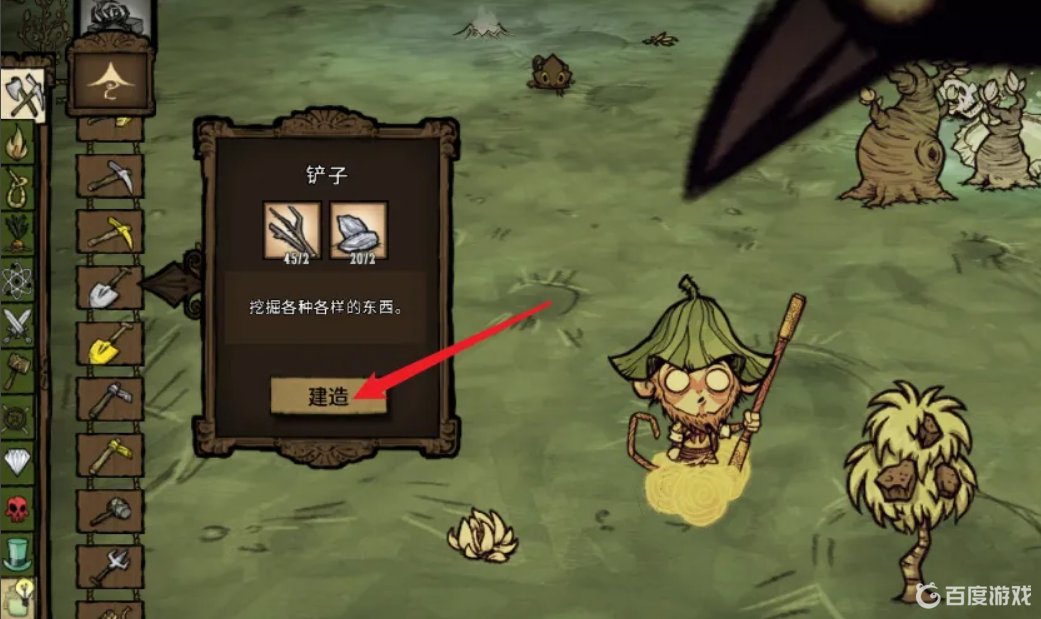 在工具製作欄消耗2個樹枝 2個燧石合成一把鏟子。